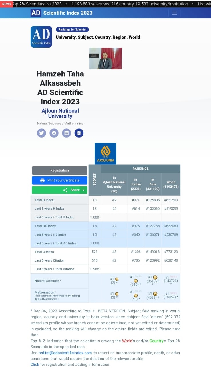 صنف الدكتور حمزة طه الكساسبة الاستاذ المشارك في الرياضيات التطبيقية ضمن قائمة الباحثين الرائدين المدرجين في قائمة AD scientific indexed 2023 لافضل 2% من علماء العالم في مجال الرياضيات والعلوم الطبيعية. ويذكر بأن الدكتور الكساسبة حاصل على شهادة الدكتوراه في الرياضيات التطبيقية من ماليزيا وشهادتي البكالوريوس والماجستير في الرياضيات من جامعة مؤتة ويعتبر الدكتور حمزة الكساسبة من الباحثين الناشطين في مجال تخصصه اذا قام بنشر أكثر من 35 ورقه علمية مصنفه في قواعد البيانات….. سكوبس