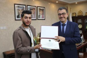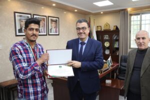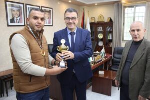 كرم رئيس جامعة عجلون الوطنية الأستاذ الدكتور فراس الهناندة يوم السبت الموافق ٢٠٢٣/٤/١٥ في مكتبه الطالب علاء عبدالكريم الغزو والطالب صلاح الدين عبابنة وذلك لحصولهم على المركز الثاني في بطولة البلياردو لجامعات إقليم الشمال الحكومية والخاصة والتي أقيمت في جامعة جدارا.
